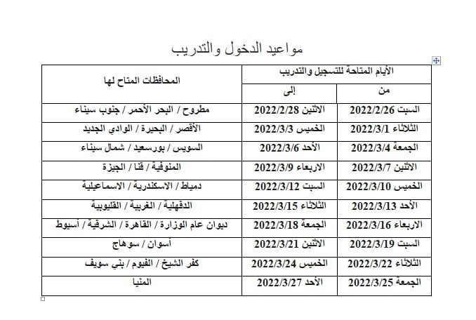 ووفقا للجدول فقد نتهت 3 محافظات من التسجيل والتدريب وهي محافظات مطروح، البحر الأحمر، جنوب سيناء وذلك خلال الفترة من السبت 26 فبراير وحتى الإثنين 28 فبراير.