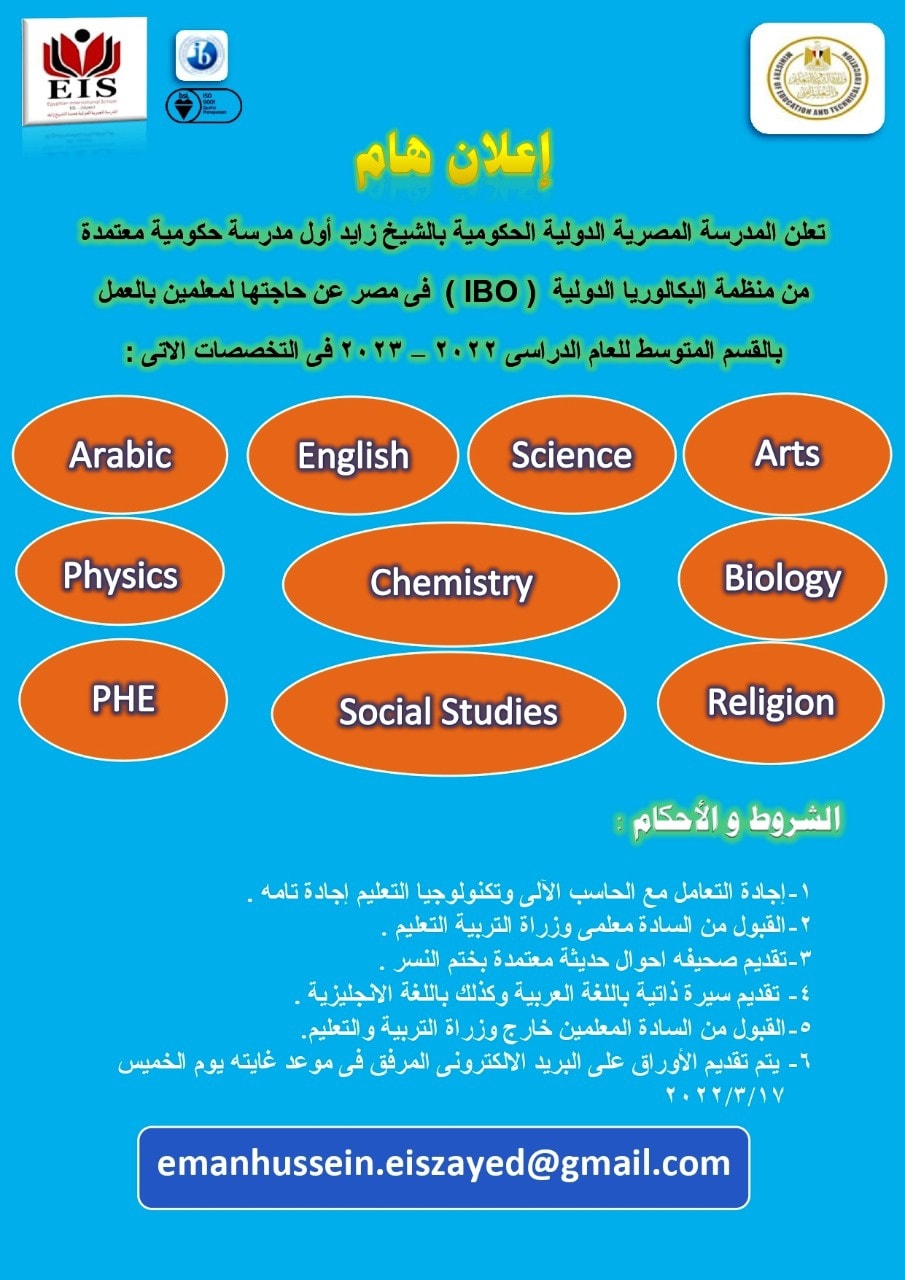 أعلنت المدرسة المصرية الدولية الحكومية بالشيخ زايد، وهي أول مدرسة حكومية معتمدة من منظمة البكالوريا الدولية في مصر عن حاجتها لمعلمين بالعمل بالقسم المتوسط للعام الدراسي 2022-2023.