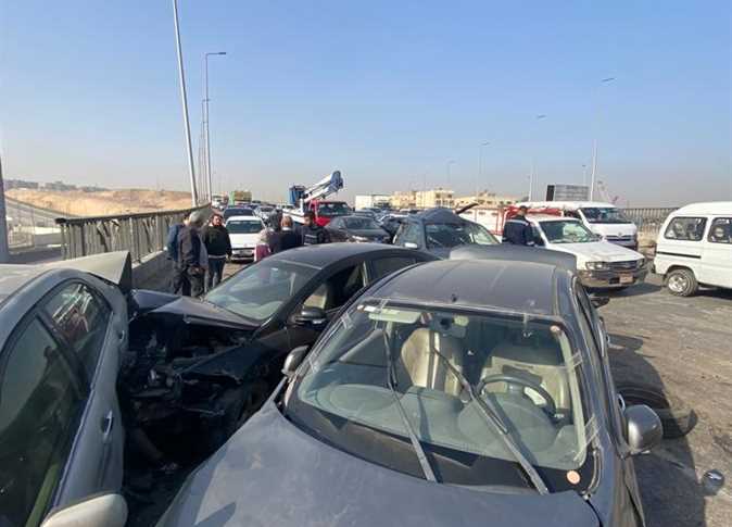 أمرت النيابة العامة في الجيزة بانتداب لجنة فنية من المرور لبيان أسباب وملابسات حادث تصادم سيارة نقل بـ 6 سيارات أعلى الطريق الدائري القادم من الواحات اتجاه المريوطية في كثافة مرورية عالية.