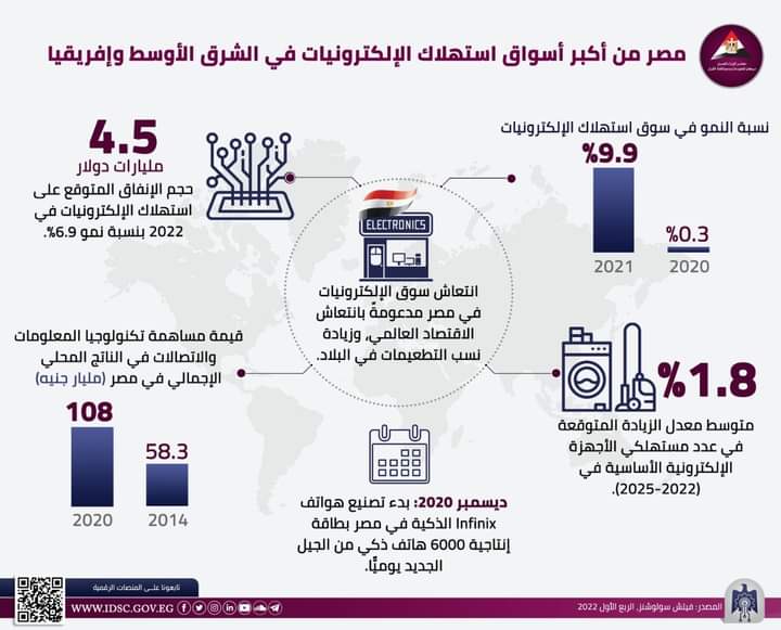 نشر مركز المعلومات ودعم اتخاذ القرار بمجلس الوزراء عبر صفحته الرسمية على موقع التواصل الاجتماعي فيسبوك، إنفوجراف، بشأن أكبر أسواق استهلاك الالكترونيات في الشرق الأوسط.