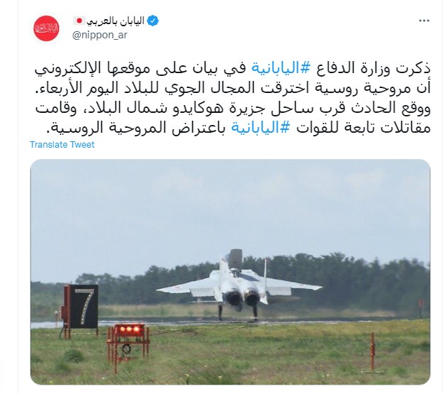 وكتبت اليابان بالعربي تغريدة على تويتر " ذكرت وزارة الدفاع #اليابانية في بيان على موقعها الإلكتروني أن مروحية روسية اخترقت المجال الجوي للبلاد اليوم الأربعاء".