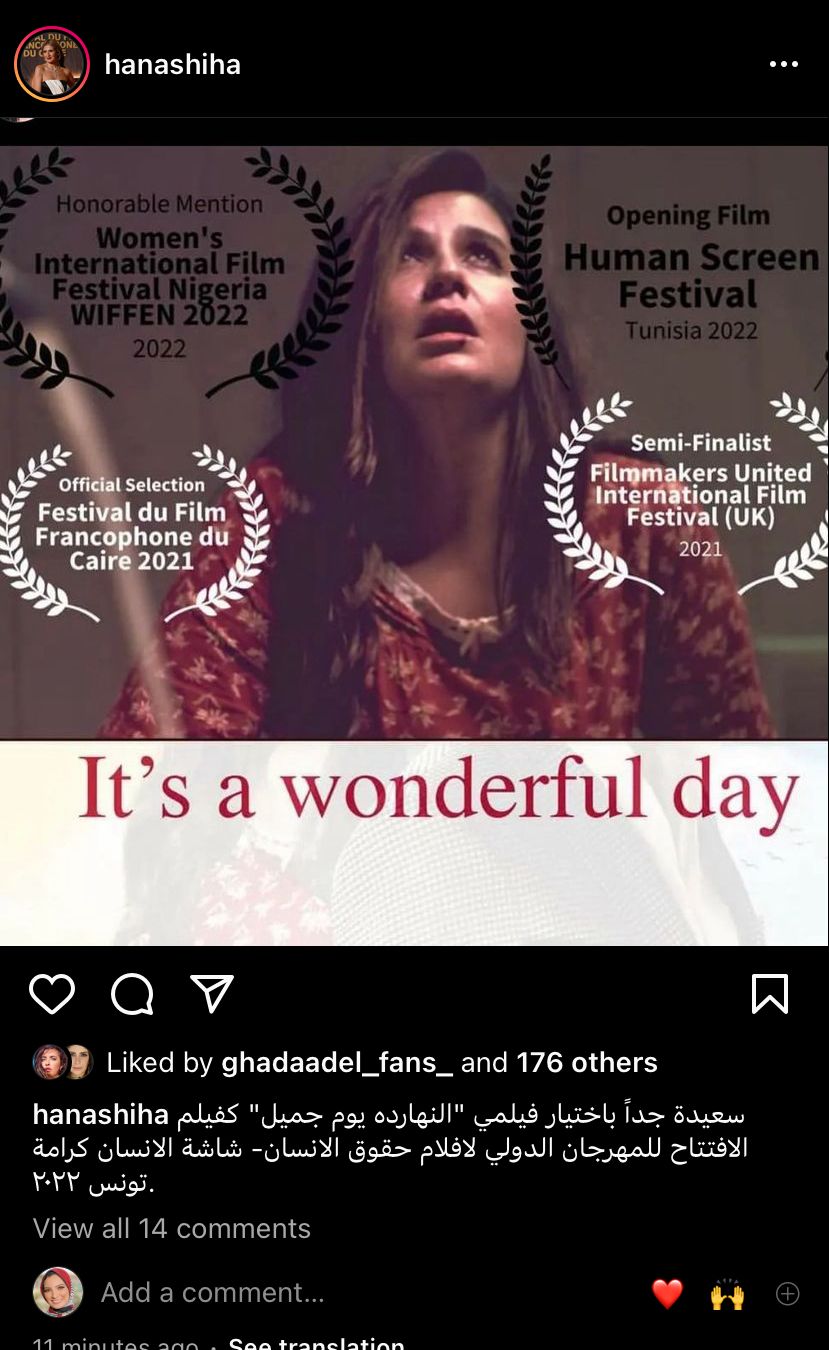 ونشرت هنا شيحة، بوستر للفيلم عبر حسابها الشخصي بموقع تبادل الصور والفيديوهات القصيرة انستجرام، معلقة: سعيد جدًا باختيار فيلمي النهاردة يوم جميل، كفيلم الافتتاح للمهرجان الدولي لأفلام حقوق الإنسان، شاشة الإنسان كرامة.