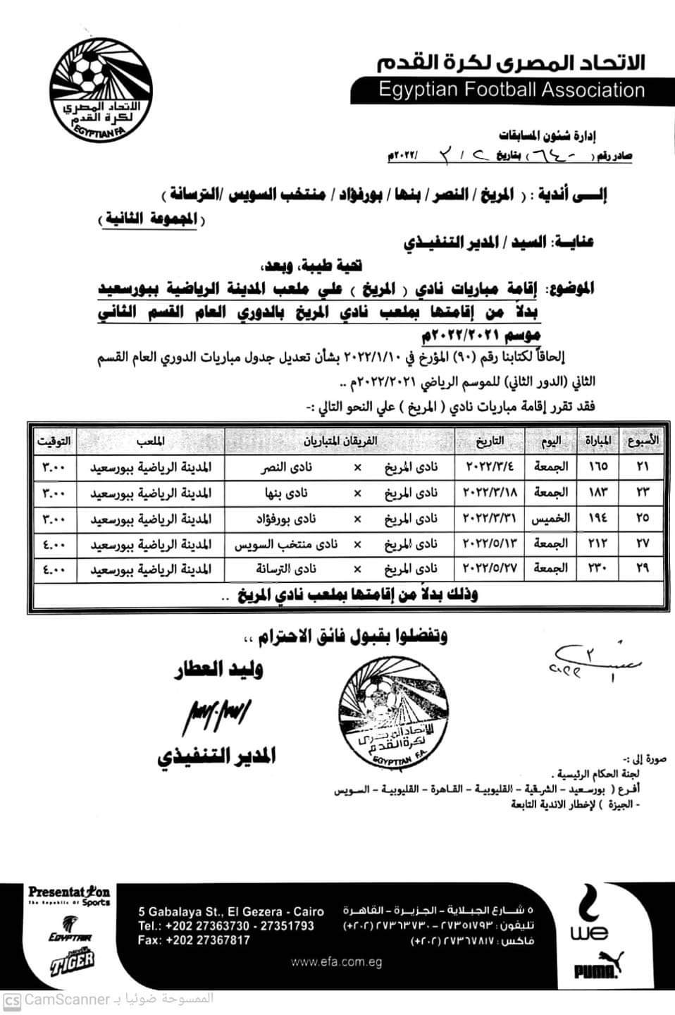 قررت لجنة مسابقات دوري القسم الثاني لكرة القدم، تعديل ملعب مباريات نادي المريخ البورسعيدي، الي ملعب المدينة الشبابية ببورسعيد بدلا من ملعب المريخ.