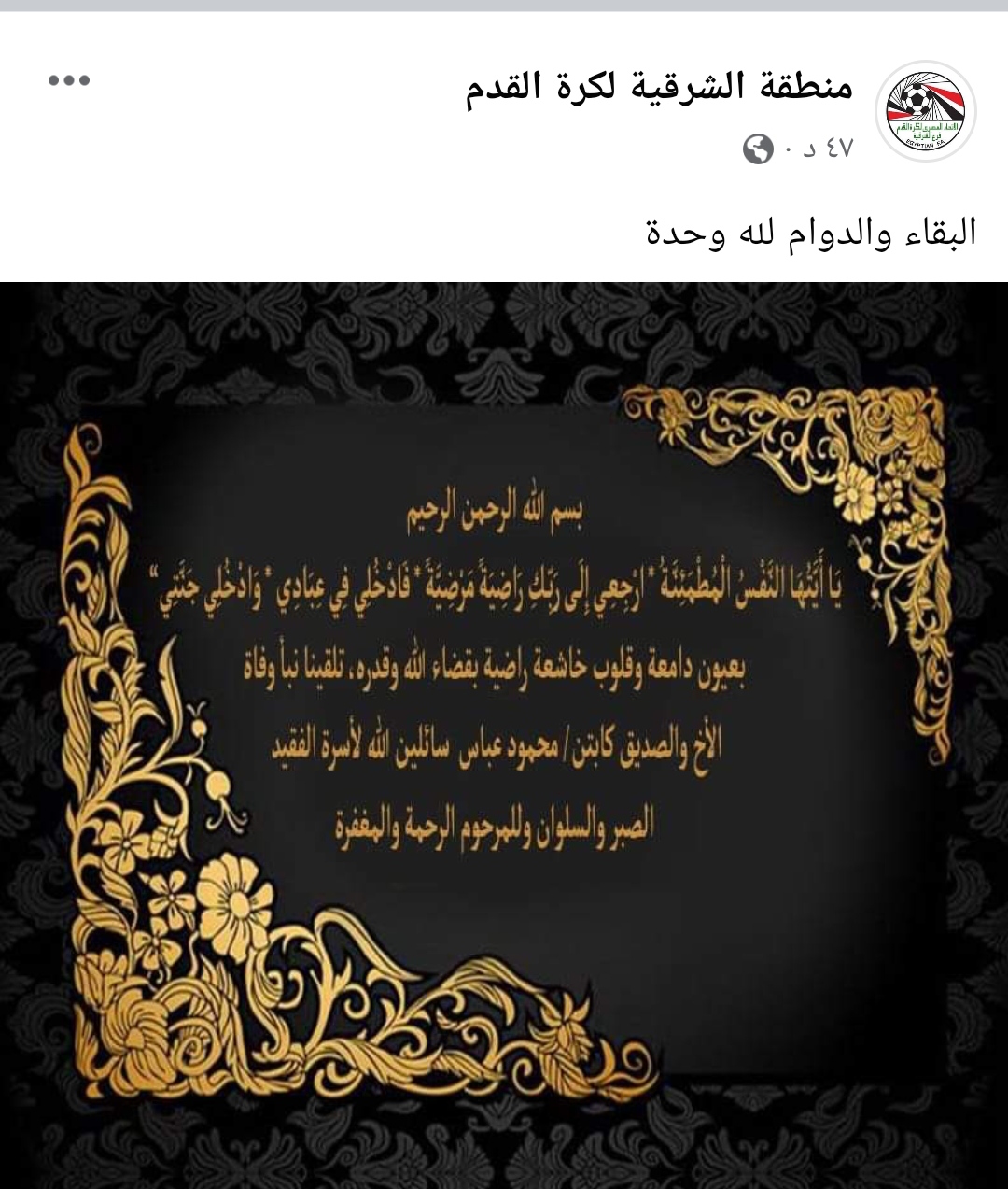 نعت منطقة الشرقية لكرة القدم، وفاة محمود عباس الصادق، رئيس لجنة مسابقات القسم الرابع بالمنطقة وعضو مجلس إدارة المنطقة الحالي والذي وافته المنية اليوم.