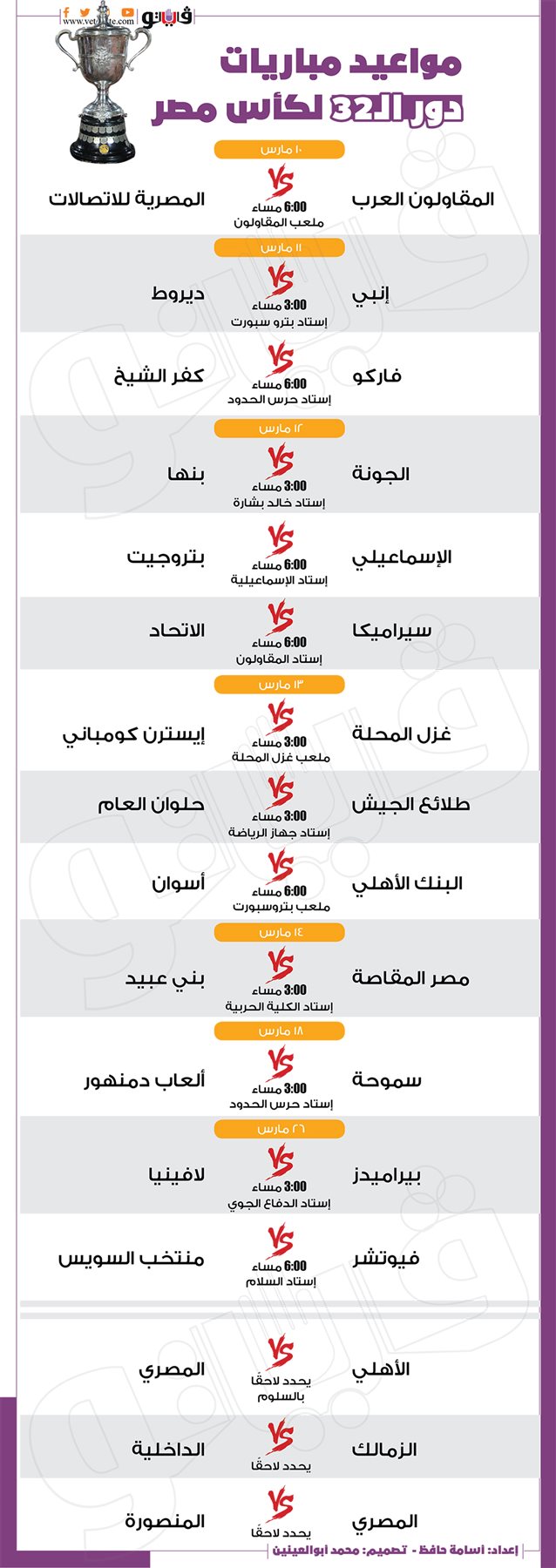 مواعيد مباريات دور الـ32 لكأس مصر | إنفوجراف الأربعاء 02/مارس/2022 - 10:00 م 3/2/2022 10:00:43 PM مواعيد المباريات اسامة حافظ شارك طباعة 18 حجم الخط شارك طباعة البنك الاهلي الأهلي بيراميدز كأس مصر المصرية للاتصالات مصر المقاصة
