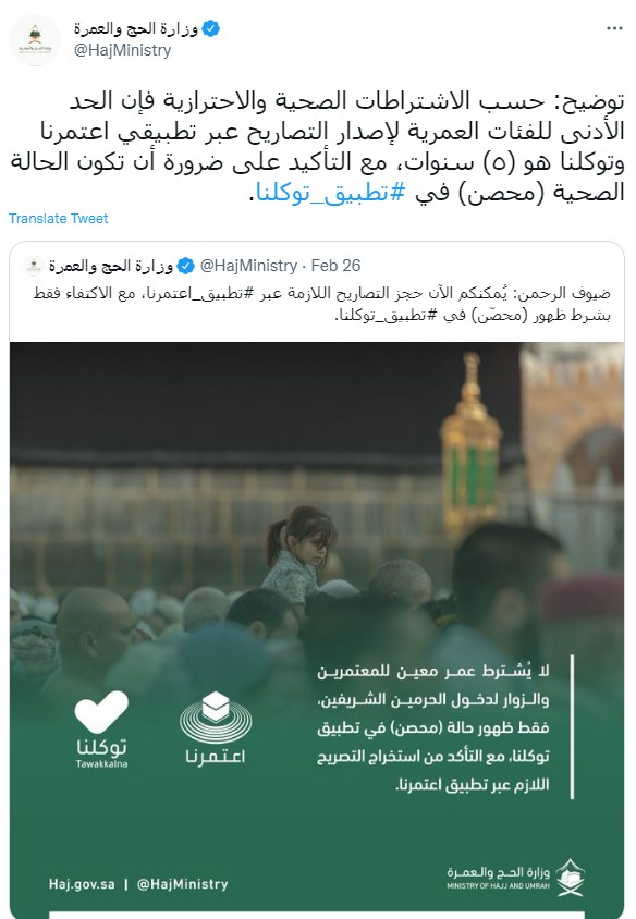 وكتبت وزارة الحج والعمرة السعودية تغريدة على تويتر "توضيح: حسب الاشتراطات الصحية والاحترازية فإن الحد الأدنى للفئات العمرية لإصدار التصاريح عبر تطبيقي اعتمرنا وتوكلنا هو (٥) سنوات، مع التأكيد على ضرورة أن تكون الحالة الصحية (محصن) في #تطبيق_توكلنا"