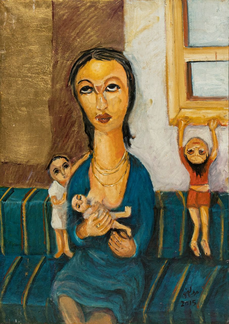 وهنا جاءت الاعمال فى ايقاع شعبى يمتزج بحس تكعيبى.. مع غلبة العناصر الهندسية..ومفردات تنتمى للطقوس الشعبية من العصفور والديك والقرد والعنزة والكف ..والشخوص التى تحورت ملامحها بوطاة الزمن..مع تداخل البيوت والكتابات بالوان جيرية منطفئة اشبه بنقوش على جدران الزمن.
