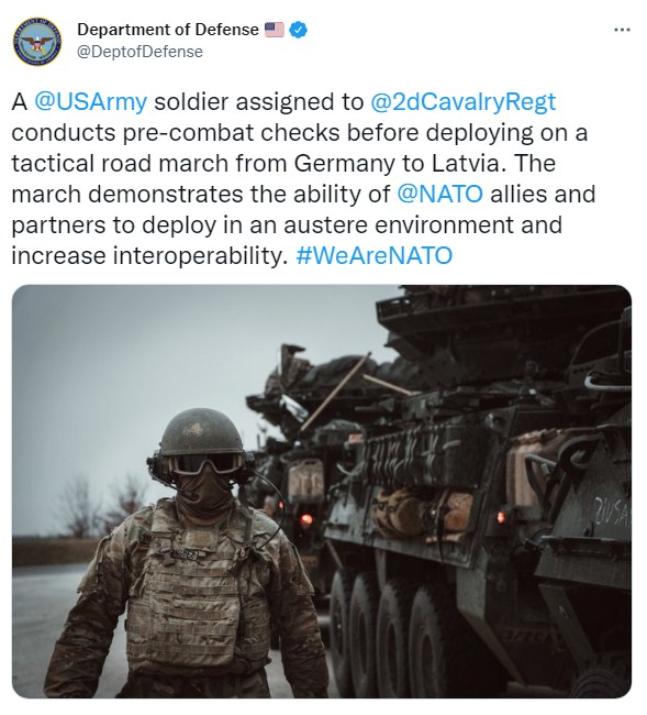 وكتبت وزارة الدفاع الأمريكية تغريدة على تويتر "جنود الجيش الأمريكي، وحدة الفرسان التابعة لجيش الولايات المتحدة في أوروبا وأمريكا، يجري تدريبات ما قبل الانتشار في مسيرة تكتيكية على الطريق من ألمانيا إلى لاتفيا. المسيرة تظهر قدرة حلفاء الناتو وشركاءهم للانتشار في بيئة قاسية لزيادة قابلية التوافق في البيئة".