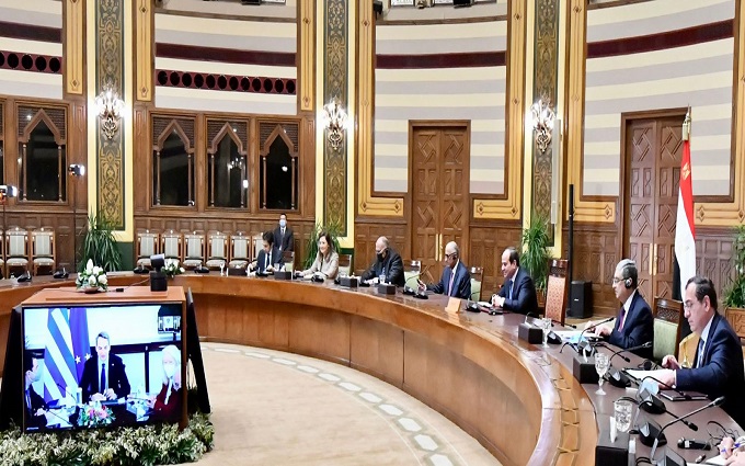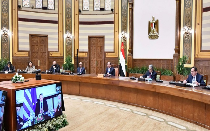عقد الرئيس عبد الفتاح السيسي اليوم في اجتماع موسع عبر الفيديو كونفرانس مع كيرياكوس ميتسوتاكيس، رئيس وزراء اليونان، وذلك بحضور محافظ البنك المركزي، ووزراء الكهرباء والطاقة المتجددة، والخارجية، والبترول والثروة المعدنية، والتخطيط والتنمية الاقتصادية، والتعاون الدولي، فضلًا عن نظرائهم من الجانب اليوناني، إلى جانب رئيس بنك الاستثمار الأوروبي".