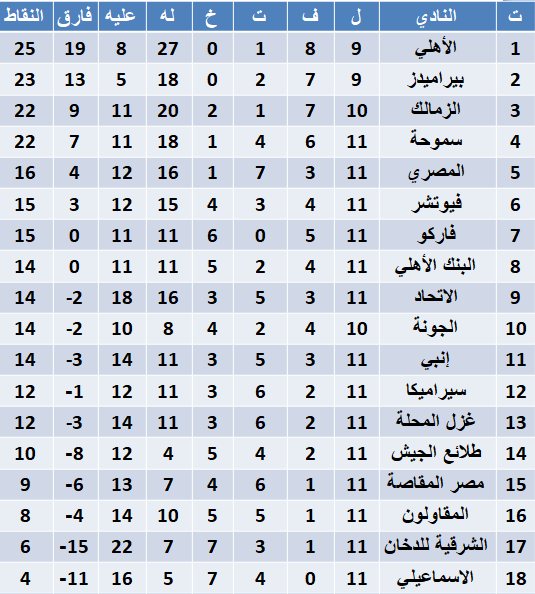 تنشر فيتو جدول ترتيب الدوري المصري الممتاز بعد انتهاء لقاء المصري وإنبي ضمن الجولة الـ 11 للمسابقة.