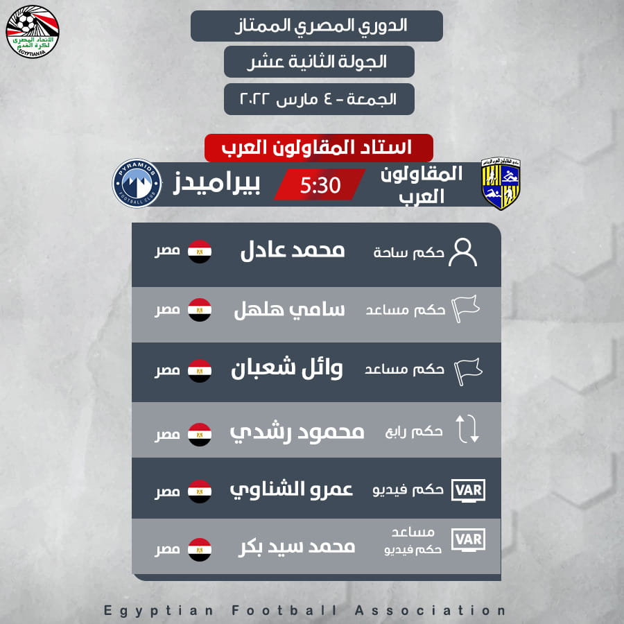 أعلنت لجنة الحكام الرئيسية باتحاد الكرة برئاسة عصام عبد الفتاح طاقم حكام مباراة المقاولون العرب وبيراميدز في بطولة الدورى المصري الممتاز.