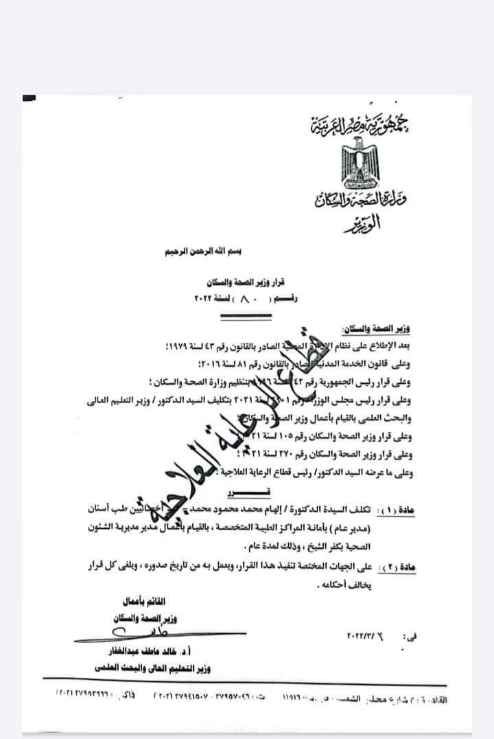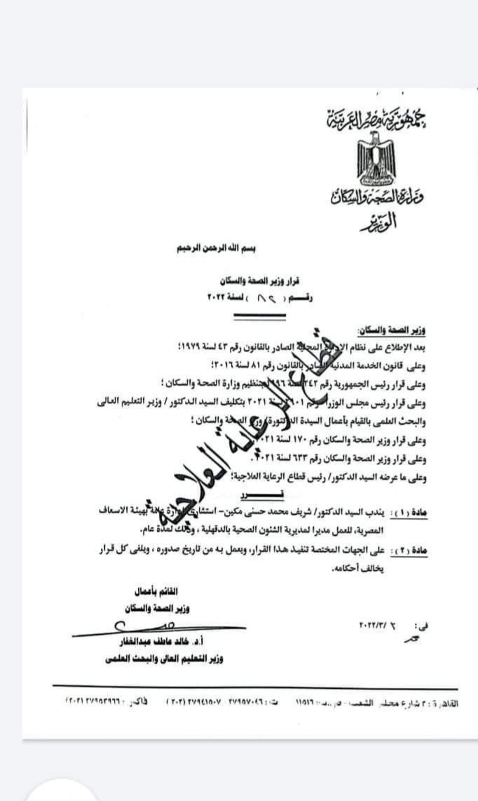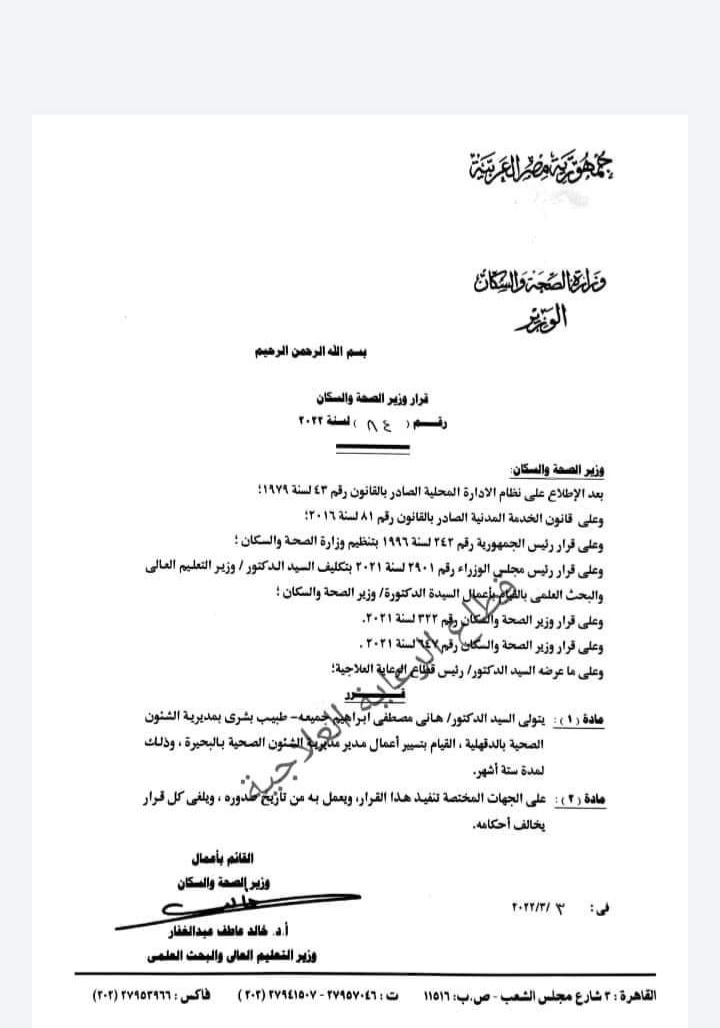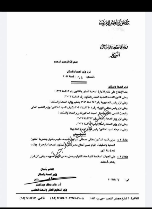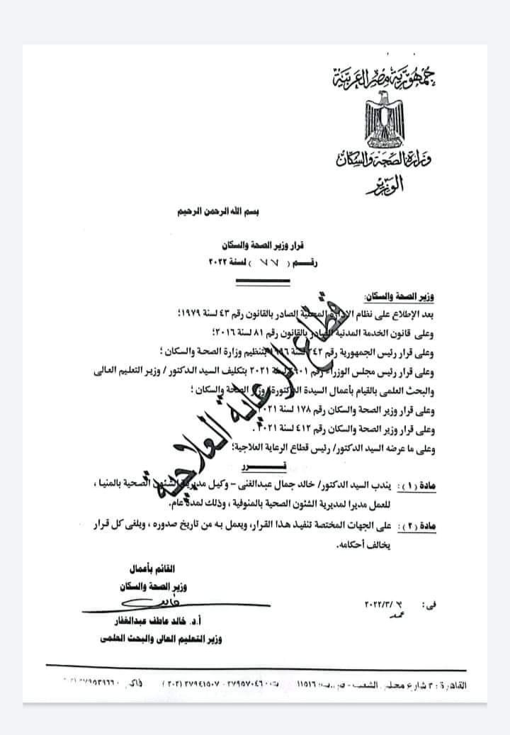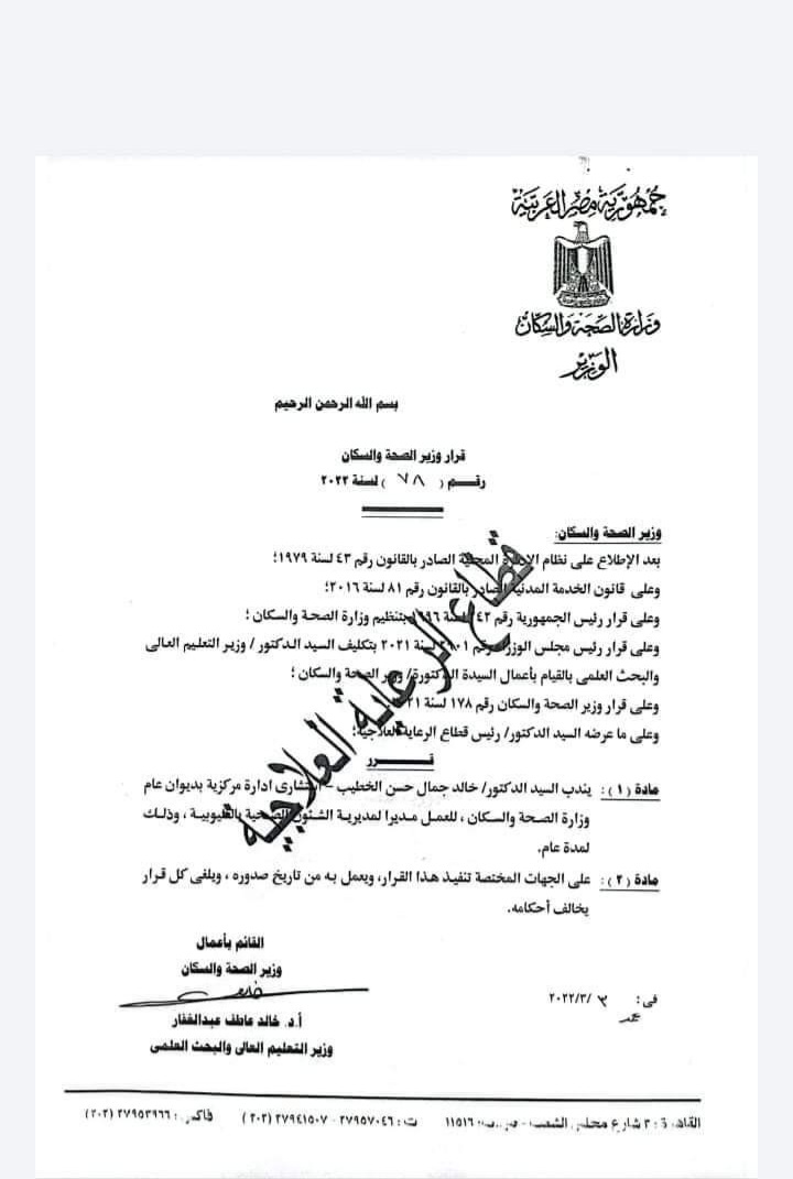 ١- تعيين الدكتور خالد الخطيب وكيلًا لصحة القليوبية.