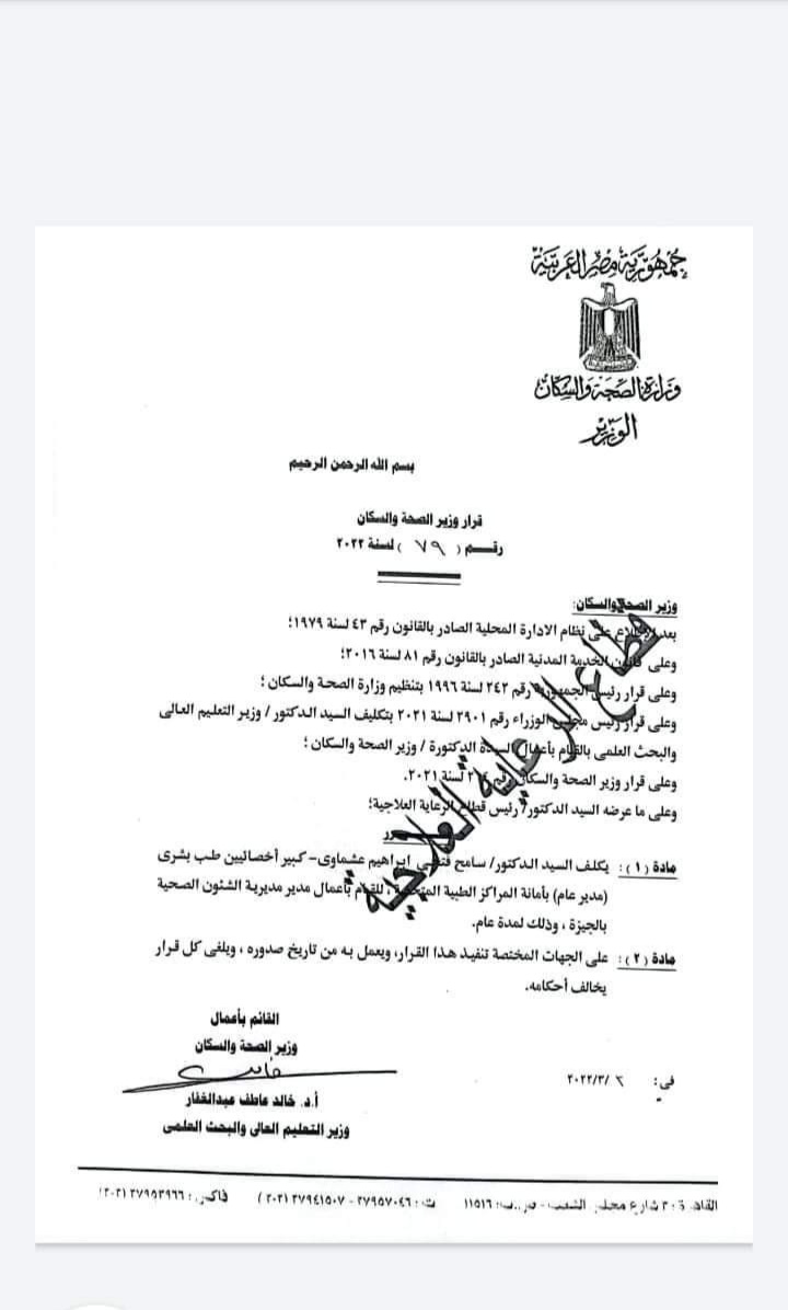 ٣- الدكتور سامح العشماوي وكيلًا لصحة الجيزة.