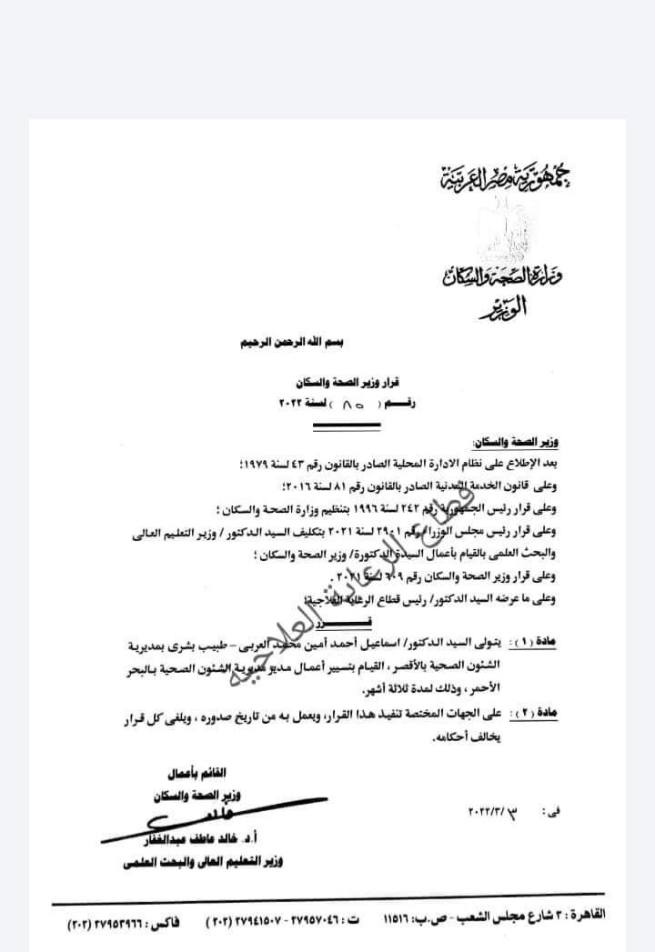 ٩- تعيين الدكتور إسماعيل أحمد العربي بصحة البحر الأحمر.