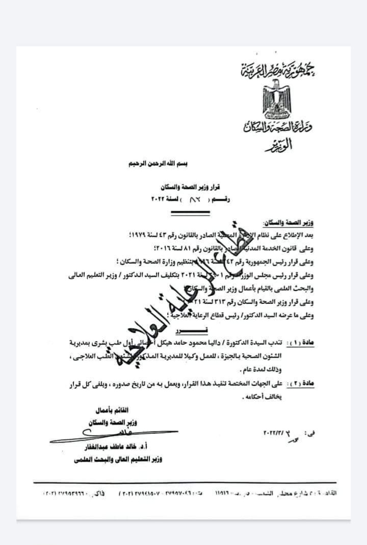 ٨- تعيين الدكتورة داليا محمود هيكل وكيل مديرية الجيزة.