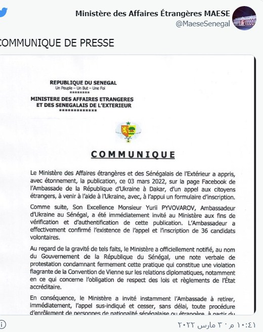 وذكرت الخارجية في بيان أن منشورًا على "فيسبوك" نشرته السفارة الأوكرانية في دكار يوم الخميس، دعا المتطوعين السنغاليين والمواطنين الأجانب في السنغال للانضمام إلى حربها ضد روسيا ووصفته بأنه "غير قانوني".