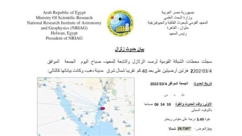 سجلت محطات الشبكة القومية لرصد الزلازل، هزتين أرضيتين على بعد 40 كم تقريبا شمال شرق مدينة دهب، صباح اليوم الجمعة.