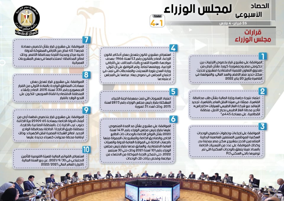 وجاء في التقرير أنه تم إصدار عدد من القرارات، تشمل قرارًا بالموافقة على مشروع قرار بخصوص الترتيبات بين حكومتي مصر وجمهورية كوريا، بشأن قرض من صندوق التعاون للتنمية الاقتصادية لمشروع تحديث سكك حديد مصر الأقصر والسد العالي، والموقعة في القاهرة بتاريخ 20 يناير 2022، بالإضافة إلى قرار باعتماد نتيجة دراسة وزارة المالية بشأن طلب محافظة القاهرة، ممثلة في هيئة النقل العام بالقاهرة، تجديد التعاقد مع شركة الغاز الطبيعي للسيارات "كارجاس" لتأجير محطة الغاز الطبيعي بجراج الأمل، منطقة القطامية، على مساحة 445م2.