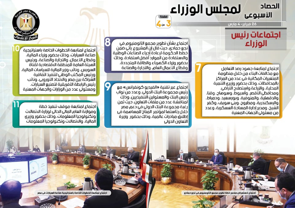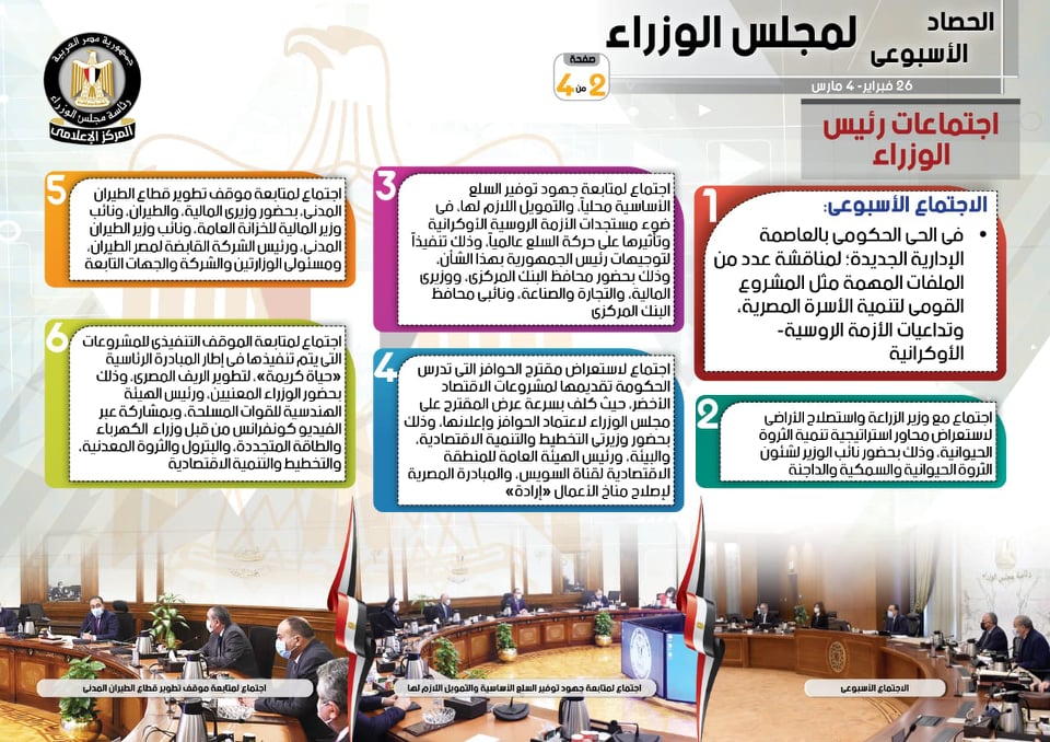 نشر المركز الإعلامي لمجلس الوزراء، تقريرًا شمل إنفوجرافات سلط من خلالها الضوء على الحصاد الأسبوعي لمجلس الوزراء، وذلك خلال الفترة من 26 فبراير حتى 4 مارس 2022، والذي تضمن الموافقة على عدد من القرارات، فضلًا عن الاجتماعات واللقاءات التي عقدها الدكتور مصطفى مدبولي، رئيس مجلس الوزراء، بالإضافة إلى ما قام به رئيس الوزراء من أنشطة.
