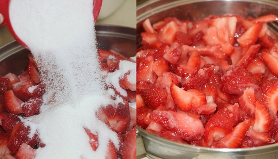 بعد تنظيف الفراولة وغسلها جيدا، تقطع حسب الرغبة لقطع صغيرة، ويوضع عليها السكر، وتوضع في الثلاجة لمدة لا تقل عن 6 ساعات، وتصل إلى ليلة كاملة.