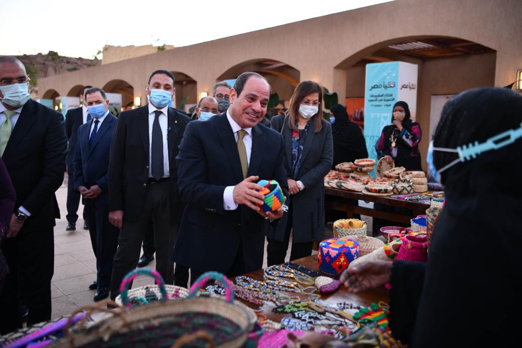 - كما تفقد الرئيس السيسي معرض الحرف التراثية في أسوان، موجها بتخصيص 200 مليون جنيه من صندوق "تحيا مصر" لتمويل العارضين بمدينة التراث بالعاصمة الإدارية، في إطار حرص الدولة على الحفاظ على التراث وإحيائه وإعطائه قوة دفع كما دعا العارضين إلى الاهتمام بالجودة العالية للمنتجات التراثية لضمان نفاذها إلى الأسواق العالمية. ووعد الرئيس السيسي المشاركين بمعرض الحرف التراثية في أسوان بإقامة معرض دائم لهم.
