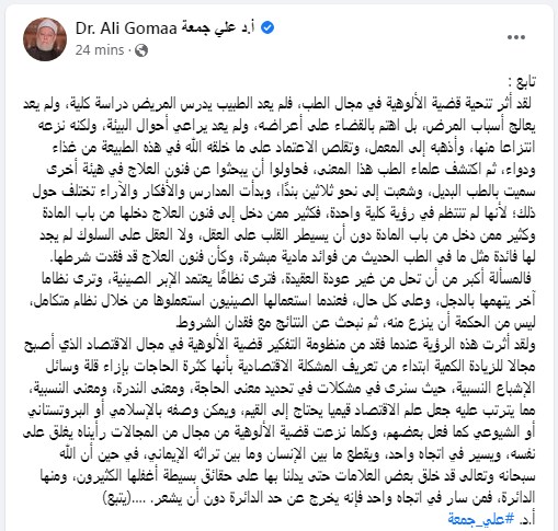 وكتب الدكتور علي جمعة تدوينة على الفيس بوك قائلا: "لقد أثر تنحية قضية الألوهية في مجال الطب، فلم يعد الطبيب يدرس المريض دراسة كلية، ولم يعد يعالج أسباب المرض، بل اهتم بالقضاء على أعراضه، ولم يعد يراعي أحوال البيئة، ولكنه نزعه انتزاعا منها، وأذهبه إلى المعمل، وتقلص الاعتماد على ما خلقه الله في هذه الطبيعة من غذاء ودواء".