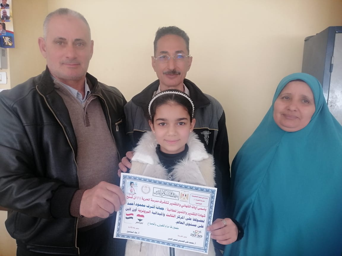 جاء ذلك تحت رعاية علاء إبراهيم إسماعيل مدير إدارة بني عبيد التعليمية وتقديرًا لاجتهادها وعرفانًا بتفوقها.