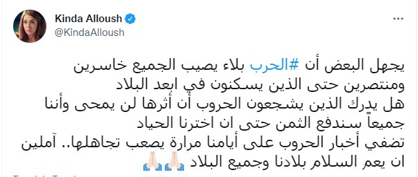 وكتبت كندة علوش تغريدة على تويتر "يجهل البعض أن #الحرب بلاء يصيب الجميع خاسرين ومنتصرين حتى الذين يسكنون في ابعد البلاد.. هل يدرك الذين يشجعون الحروب أن أثرها لن يمحى وأننا جميعًا سندفع الثمن حتى ان اخترنا الحياد.."