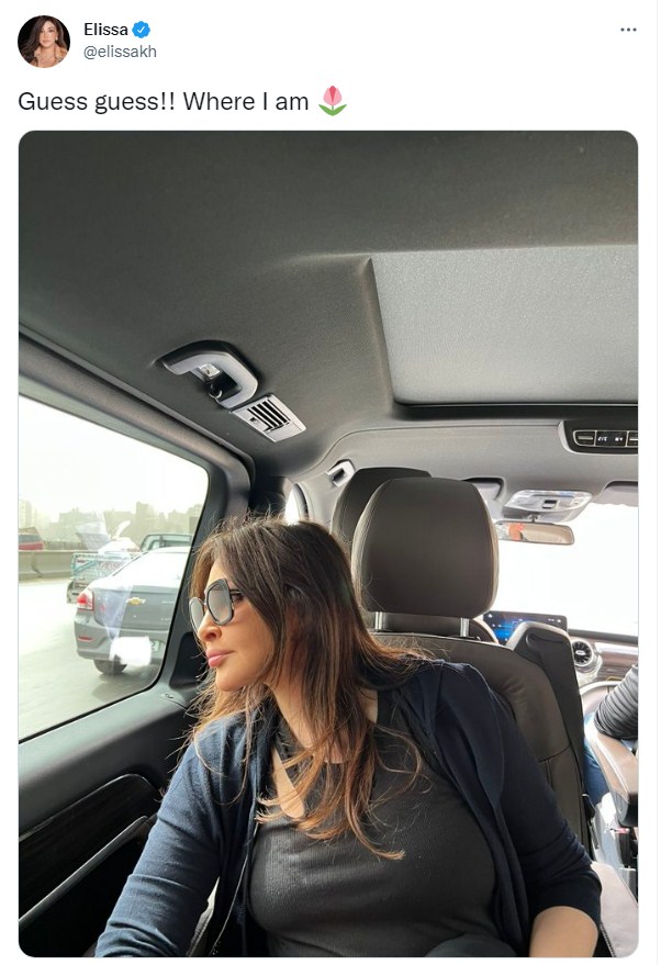 وكتبت الفنانة إليسا تغريدة عبر حسابها بتويتر فقالت: "خمنوا!! أين أنا" وأرفقت تغريدتها بصورة لها راكبة سيارة أثناء سيرها على أحد الطرق.