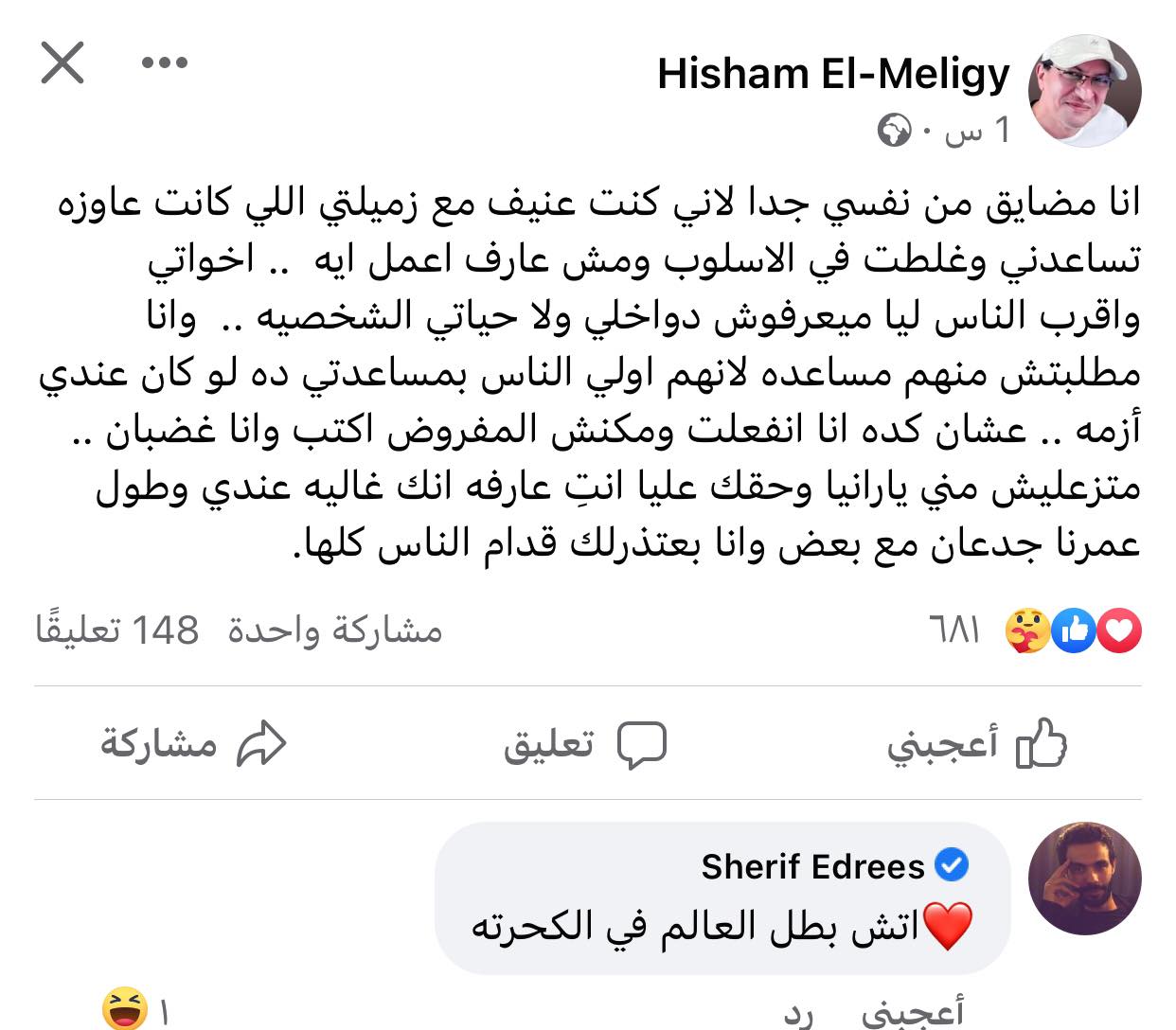 وكتب "المليجي" من خلال حسابه الشخصي بموقع التواصل الإجتماعي "فيس بوك": “أنا مضايق من نفسي جدا لأني كنت عنيف مع زميلتي اللي كانت عاوزه تساعدني وغلطت في الأسلوب ومش عارف اعمل ايه .. اخواتي وأقرب الناس ليا ميعرفوش دواخلي ولا حياتي الشخصيه.. وأنا مطلبتش منهم مساعدة لأنهم أولى الناس بمساعدتي ده لو كان عندي أزمة.. عشان كده انا انفعلت ومكنش المفروض اكتب وانا غضبان.. متزعليش مني يارانيا وحقك عليا انتِ عارفه انك غاليه عندي وطول عمرنا جدعان مع بعض وانا بعتذرلك قدام الناس كلها”.