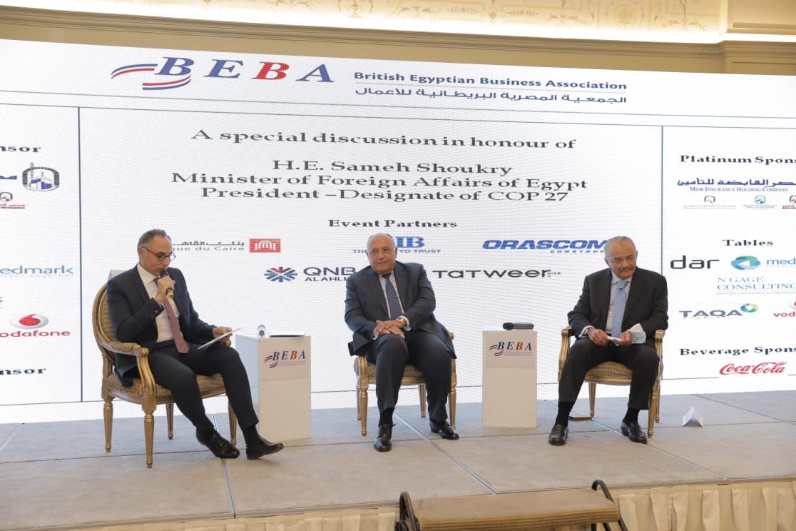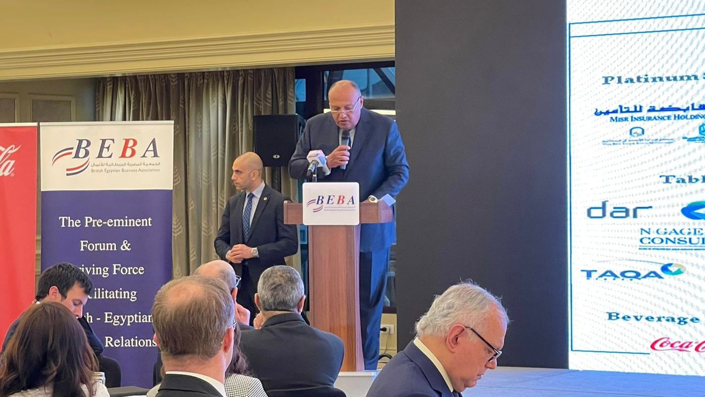 وقال المتحدث الرسمي باسم وزارة الخارجية السفير أحمد حافظ، إن وزير الخارجية ألقى كلمة خلال الحدث أشاد فيها بالدور الذي تضطلع به الجمعية في تعزيز العلاقات التجارية والاقتصادية بين مصر وبريطانيا، معربًا عن التطلع إلى أن يُسهم هذا الحدث في تعزيز الجهود الجارية للتحضير للدورة ٢٧ لمؤتمر أطراف اتفاقية الأمم المتحدة الإطارية لتغير المُناخ.