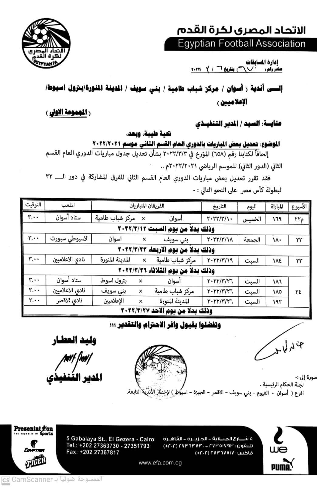 أخطرت لجنة مسابقات دوري القسم الثانى، نادى أسوان بالتعديلات الجديدة لمواعيد مباريات الأسابيع القادمة لتماسيح النيل بسبب مشاركة الفريق في بطولة كأس مصر.