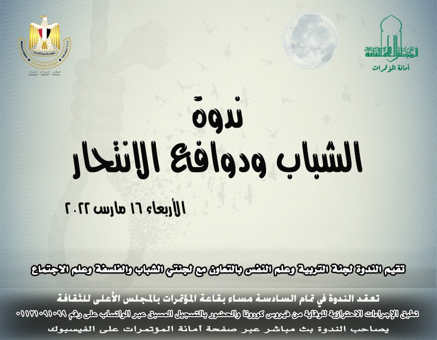 يعقد المجلس الأعلى للثقافة بأمانة الدكتور هشام عزمي، ندوة "الشباب ودوافع الانتحار"..