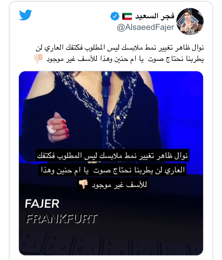 وقالت السعيد في تغريدتها المرفقة بصورة للفنانة نوال من الحفل الغنائي: ”نوال ظاهر تغيير نمط ملابسك ليس المطلوب فكتفك العاري لن يطربنا نحتاج صوت يا ام حنين وهذا للأسف غير موجود“.