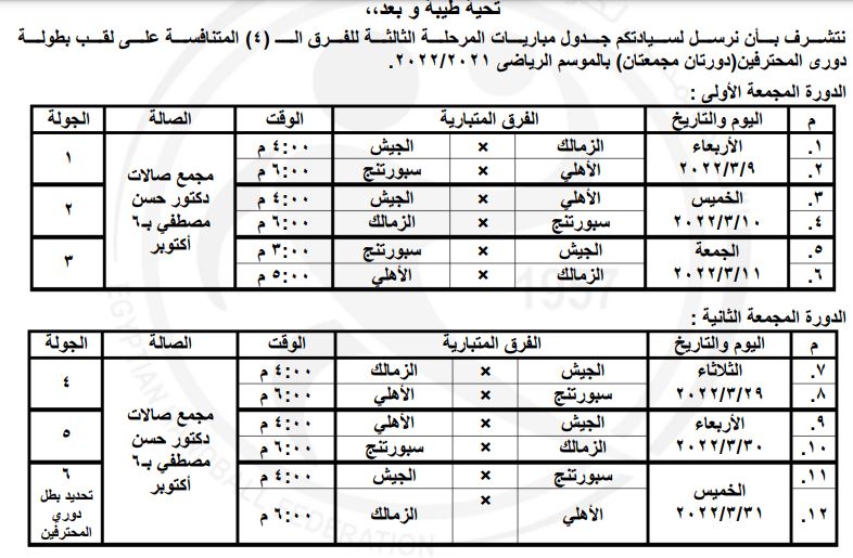 ويأتي جدول مباريات الدورتين المجمعتين كالتالي: