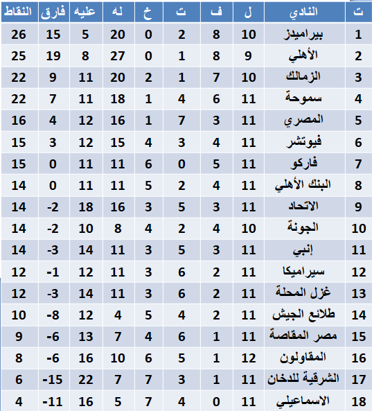 وجاء جدول ترتيب الدوري الممتاز كالتالي: