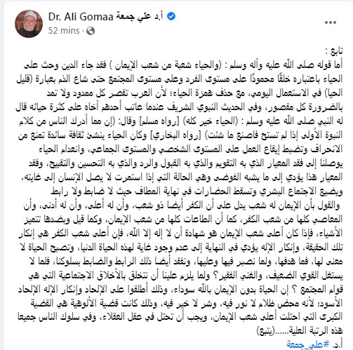 وكتب الدكتور علي جمعة تدوينة على الفيس بوك "أما قوله صلى الله عليه وآله وسلم: (والحياء شعبة من شعب الإيمان ) فقد جاء الدين وحث على الحياء باعتباره خلقًا محمودًا على مستوى الفرد وعلى مستوى المجتمع حتى شاع الذم بعبارة (قليل الحيا) في الاستعمال اليومي، مع حذف همزة الحياء؛ لأن العرب تقصر كل ممدود ولا تمد بالضرورة كل مقصور"