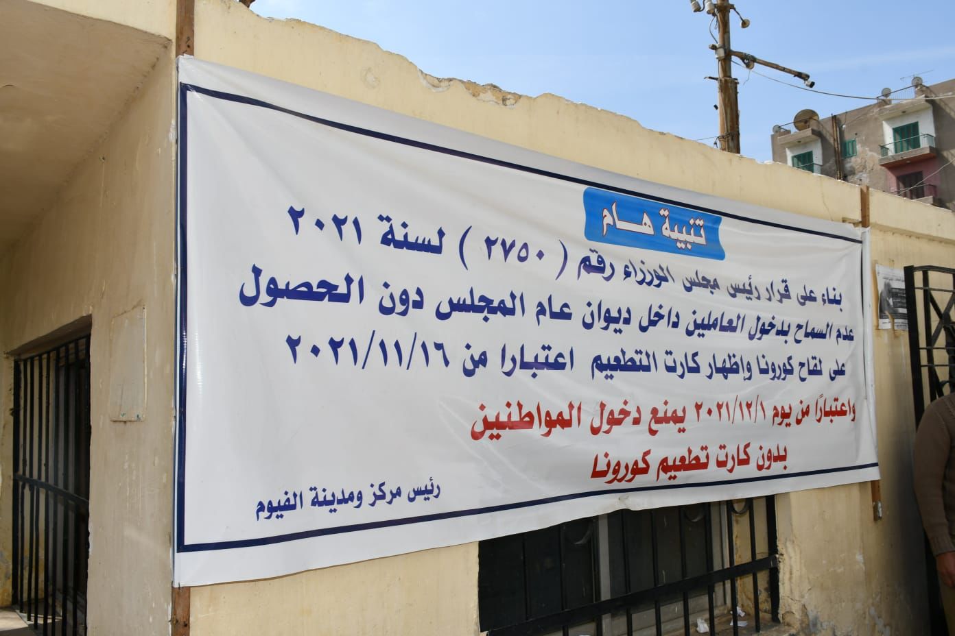 تفقد اليوم الدكتور أحمد الأنصاري محافظ الفيوم، أعمال حملة "طرق الأبواب" والتى إنطلقت أمس وتستمر حتى 15 من شهر مارس الجاري، للتأكد من تلقي المواطنين وموظفي المصالح الحكومية والمواقع الخدمية من تلقي لقاح كورونا، كما تفقد سير العمل بالمركز التكنولوجي وعدد من إدارات مجلس مدينةالفيوم، بحضور الدكتور محمد التوني معاون المحافظ، والأستاذ أحمد شاكر رئيس الوحدة المحلة لمركز ومدينة الفيوم.