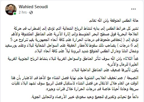 وكتب وحيد سعودي تدوينة على الفيس بوك "حالة الطقس المتوقعة بإذن الله تعالى تشير كل خرائط الطقس إلى بداية لنشاط الرياح الشمالية التي تؤدي إلى اضطراب فى حركة الملاحة البحرية فوق مسطح البحر المتوسط، وإلى إثارة الأتربة على المناطق المكشوفة والأهم تؤدي إلى (انخفاض ملحوظ في درجات الحرارة على كافة أنحاء الجمهورية بقيم تتراوح من 5 إلى 6 درجات) يصاحب ذلك سقوط للأمطار الخفيفة على السواحل الشمالية للبلاد وعلى بورسعيد وشمال الدلتا ومازال الطقس المتوقع شديد البرودة ليلًا على كافة أنحاء البلاد".