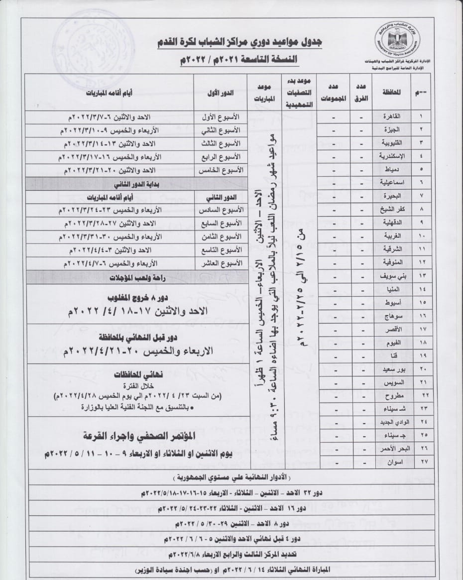 أعلنت اللجنة المنظمة من بطولة دوري مراكز الشباب بوزارة الشباب والرياضة من خلال الإدارة المركزية لمراكز الشباب والهيئات الشبابية، جدول دوري مراكز الشباب النسخة التاسعة بالكامل من بدايته، والذي أنطلق أمس ويستمر حتي منتصف يونيو المقبل.