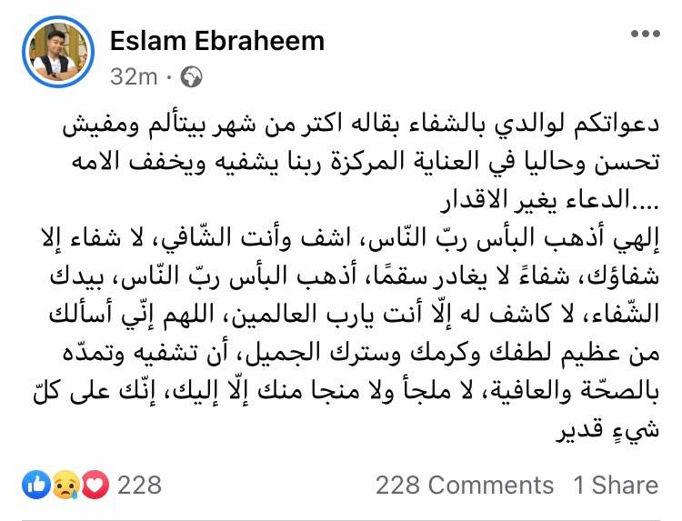 وكتب إسلام إبراهيم منذ قليل من خلال حسابه الشخصي على موقع التواصل الاجتماعي "فيس بوك": "دعواتكم لوالدي بالشفاء بقاله أكتر من شهر بيتألم ومفيش تحسن وحاليا في العناية المركزة ربنا يشفيه ويخفف آلامه ….الدعاء يغير الأقدار.. إلهي أذهب البأس ربّ النّاس، اشف وأنت الشّافي، لا شفاء إلا شفاؤك، شفاءً لا يغادر سقمًا، أذهب البأس ربّ النّاس، بيدك الشّفاء، لا كاشف له إلّا أنت يارب العالمين، اللهم إنّي أسألك من عظيم لطفك وكرمك وسترك الجميل، أن تشفيه وتمدّه بالصحّة والعافية، لا ملجأ ولا منجا منك إلّا إليك، إنّك على كلّ شيءٍ قدير.