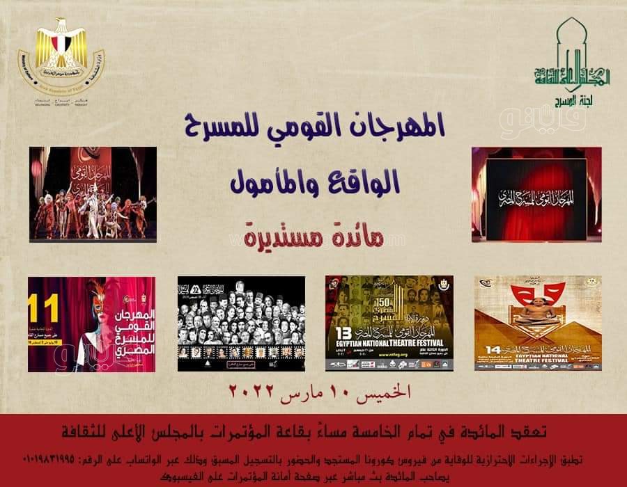 تعقد لجنة المسرح بالمجلس الأعلى للثقافة ومقررها المخرج عصام السيد، مائدة مستديرة بعنوان "المهرجان القومي للمسرح.. الواقع والمأمول".. وذلك في تمام الساعة الخامسة من مساء يوم الخميس الموافق 10 مارس الحالي؛ بقاعة الفنون بالمجلس الأعلى للثقافة.