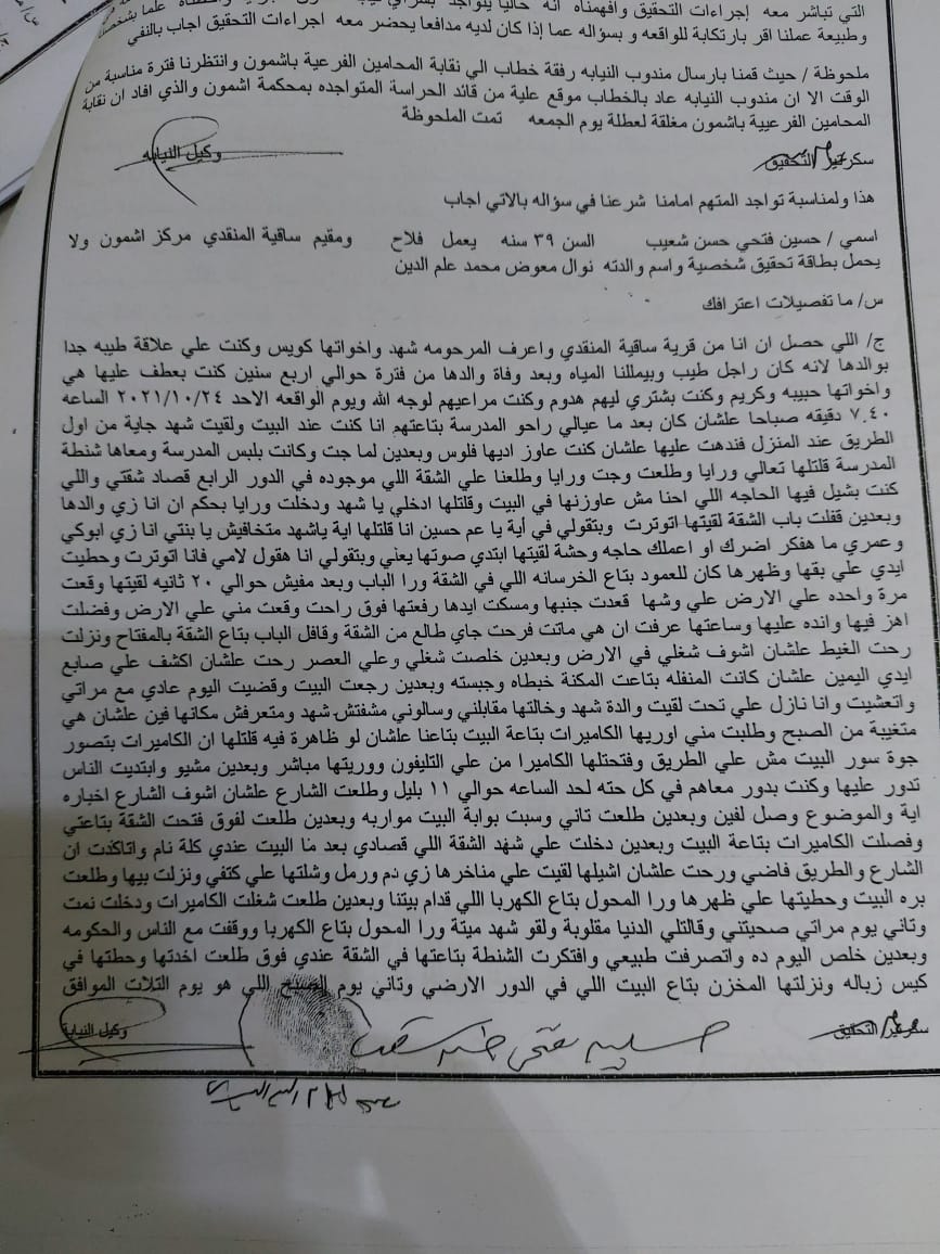 "اللي حصل ان انا من قرية ساقية المنقدي وأعرف المرحومه شهد كويس، وكنت علي علاقة طيبه بوالدها لإنه كان راجل طيب ويقوم بمليء المياه لنا، وبعد وفاة والدها من فتره حوالي 4 سنوات كنت بعطف عليها هي وإخواتها حبيبة وكريم، وكنت بشتري ليهم هدوم وكنت مراعيهم لوجه الله" هكذا قال المتهم حسين فتحي شعيب 39 سنه ويعمل فلاح إعترافاته للنيابة وأضاف قائلًا؛ الواقعة حدثت يوم 24-10-2021 في تمام الساعه 7:40 دقيقة، بعد ذهاب أبنائي للمدرسة، كنتُ عند المنزل، ووجدت شهد جاية من أول الطريق عند المنزل، فندهت عليها علشان كنت عاوز اديها فلوس، وبعدين لما جت وكانت بلبس المدرسة وشنطة المدرسة قولتلها تعالي ورايا.