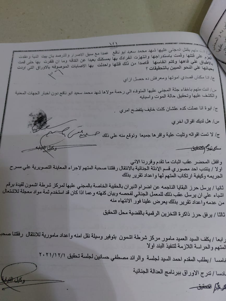 وأشار المتهم حسين شعيب قائلًا: بعدها نزلت رحت الغيط وشوفت شغلي وعلي العصر رجعت ورحت اكشف علي صُباعي علشان منفلة المكنه خبطته وجبسته، وقضيت اليوم عادي مع اسرتي واتعشيت معاهم، وجت مامة شهد سالتني عليها ووريتها الكاميرات مباشر من علي الموبايل ومشيت، وكل الناس كانت بتدور وانا بدور معاهم لحد الساعه 11 بليل وطلعت لقيت الشارع مفيهوش حد طلعت جبت شهد وكان في زي الدم ورمل علي وشها فشيلتها علي كتفي وفصلت الكاميرات ونزلت وحطيتها ورا محول الكهرباء اللي قدام بيتنا علي ضهرها ومشيت، وشغلت الكاميرا وطلعت نمت وصحيت علي زوجتي بتقولي لقوا جثة شهد ونزلت وقفت مع الناس والحكومه وروحت البيت وإفتكرت الشنطه بتاعتها في الشقه فطلعت اخدتها وحطيتها جوا كيس زباله، ونزلتها المخزن اللي في الدور الارضي وتاني يوم اتصلت علي صاحبي عبوده علشان يوديني الغيط واخدت الكيس اللي فيه الشنطه وحطيتها في شنطه خضار وجبت جردل وبدءات افضي اللي في الشنطه علشان احرقة.