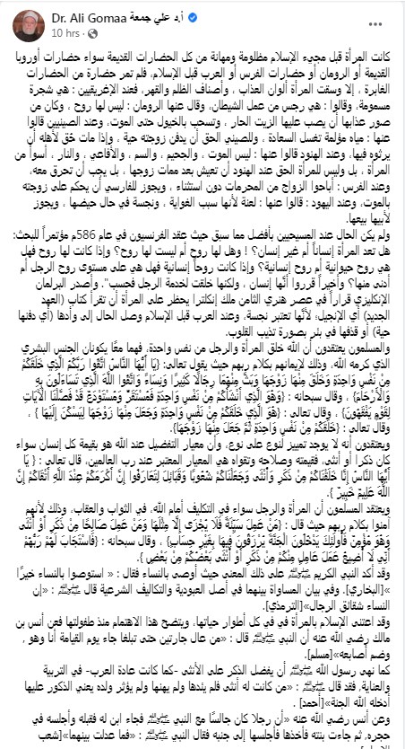 وكتب الدكتور على جمعة تدوينة على الفيس في في اليوم العالمي للمرأة فقال: "كانت المرأة قبل مجيء الإسلام مظلومة ومهانة من كل الحضارات القديمة سواء حضارات أوروبا القديمة أو الرومان أو حضارات الفرس أو العرب قبل الإسلام، فلم تمر حضارة من الحضارات الغابرة، إلا وسقت المرأة ألوان العذاب، وأصناف الظلم والقهر".