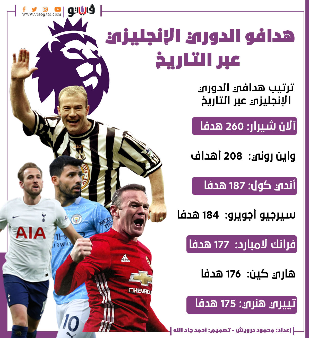 هدافو الدوري الإنجليزي عبر التاريخ | إنفوجراف الأربعاء 09/مارس/2022 - 04:19 م 3/9/2022 4:19:17 PM هاري كين محمود درويش شارك طباعة 18 حجم الخط شارك طباعة ترتيب هدافي الدوري الإنجليزي الان شيرار واين روني سيرجيو اجويرو هاري كين تييري هنري