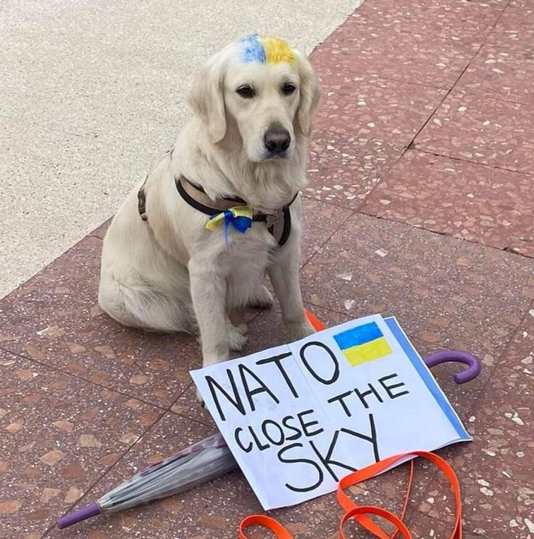 وسخر الأوكرانيون من موقف حلف شمال الأطلسي بإظهار لافتة تحت قدم كلب مرسوم على رأسه علم أوكرانيا، وتدعو الناتو إلى إقامة منطقة حظر طيران في وجه روسيا.