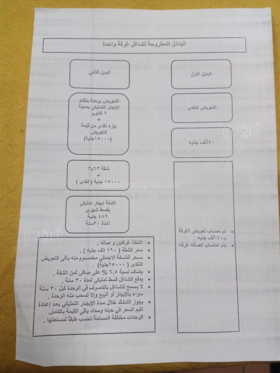 واضاف المصدر ان قاطني محور ترسا والذي تم تنفيذه، فوصلت، فتصل قيمة التعويضات التي تم صرفها عن الغرفة 40 ألف جنيه وتحسب الصالة غرفة، وتم التعويض نقدي للبعض، فيما وافق البعض الآخر علي الحصول علي وحدة بديلة بمدينة 6 أكتوبر، وهي عبارة عن غرفتين وصالة مساحتها 63 متر، بنظام الإيجار التمليكي بقسط شهري 489 جنيه شهريا لمدة 30 سنة، ويصل سعرها إلى 190 ألف جنيه، ويحصل الساكن على 15 ألف جنيه مع استلام الوحدة البديلة.