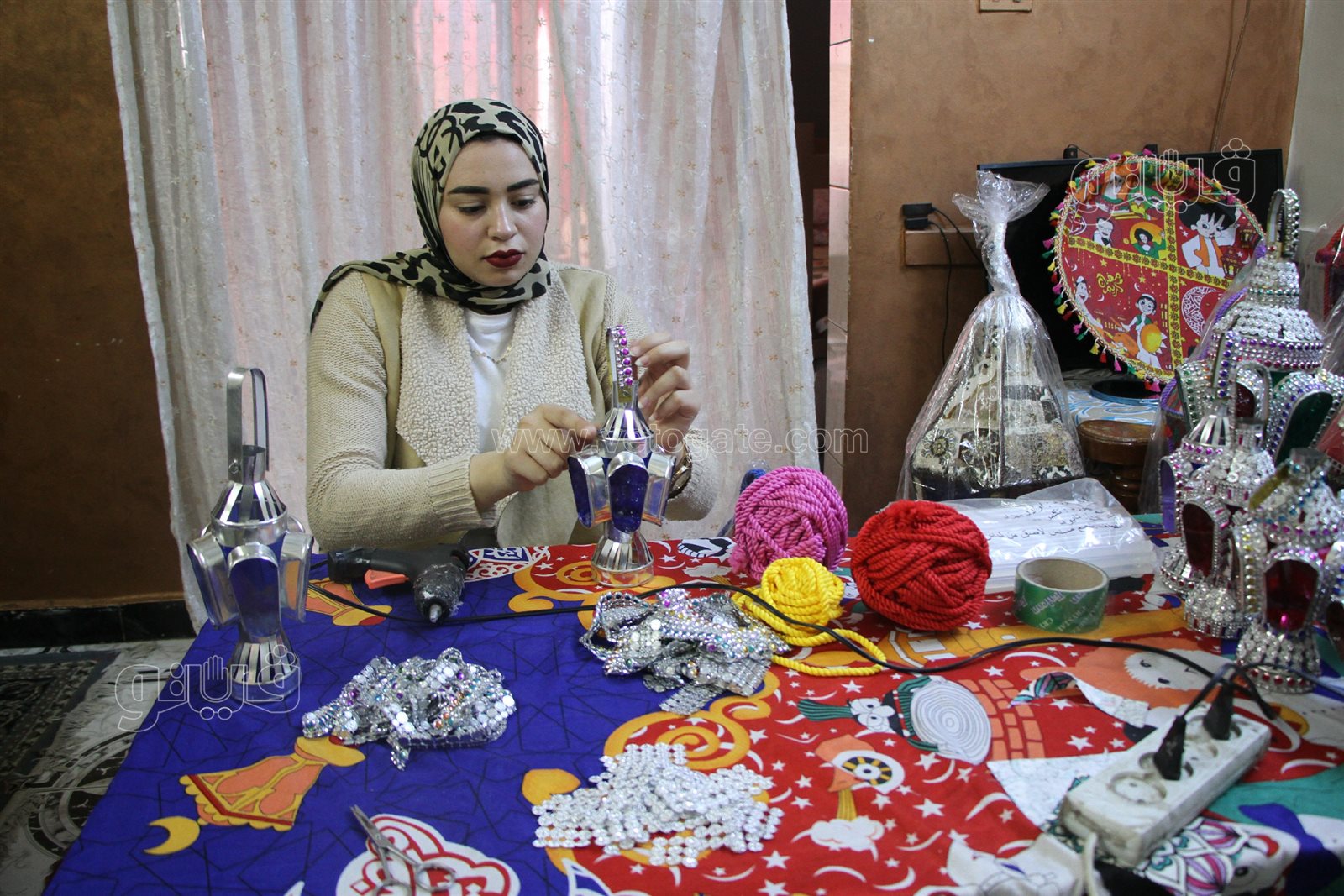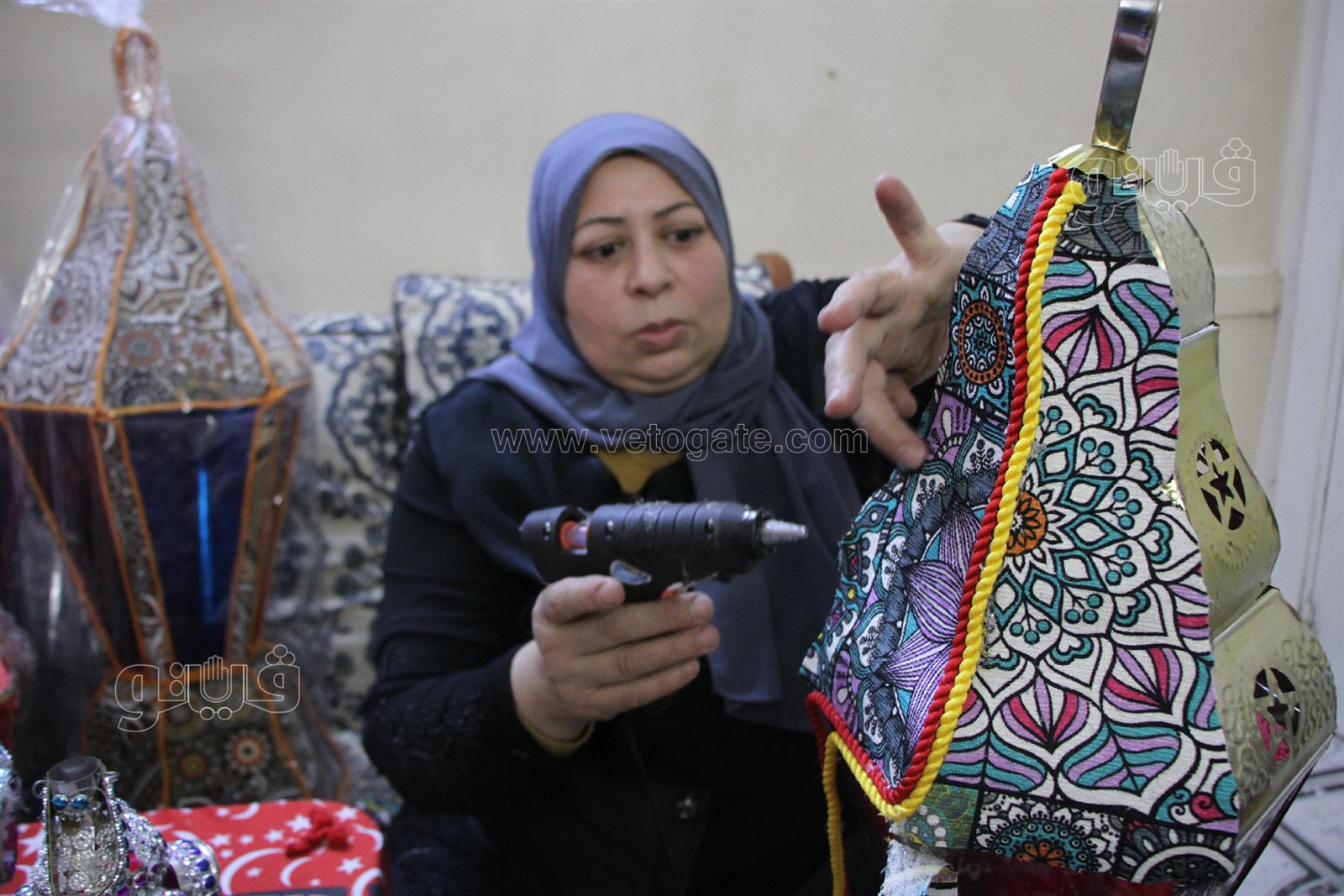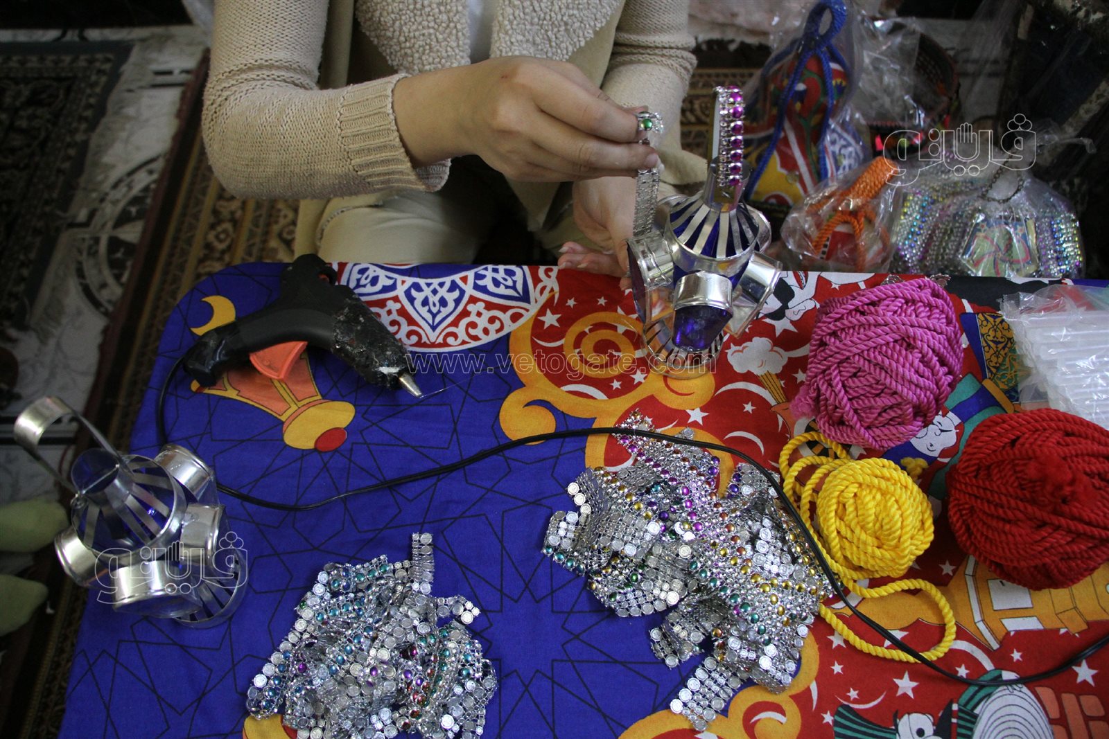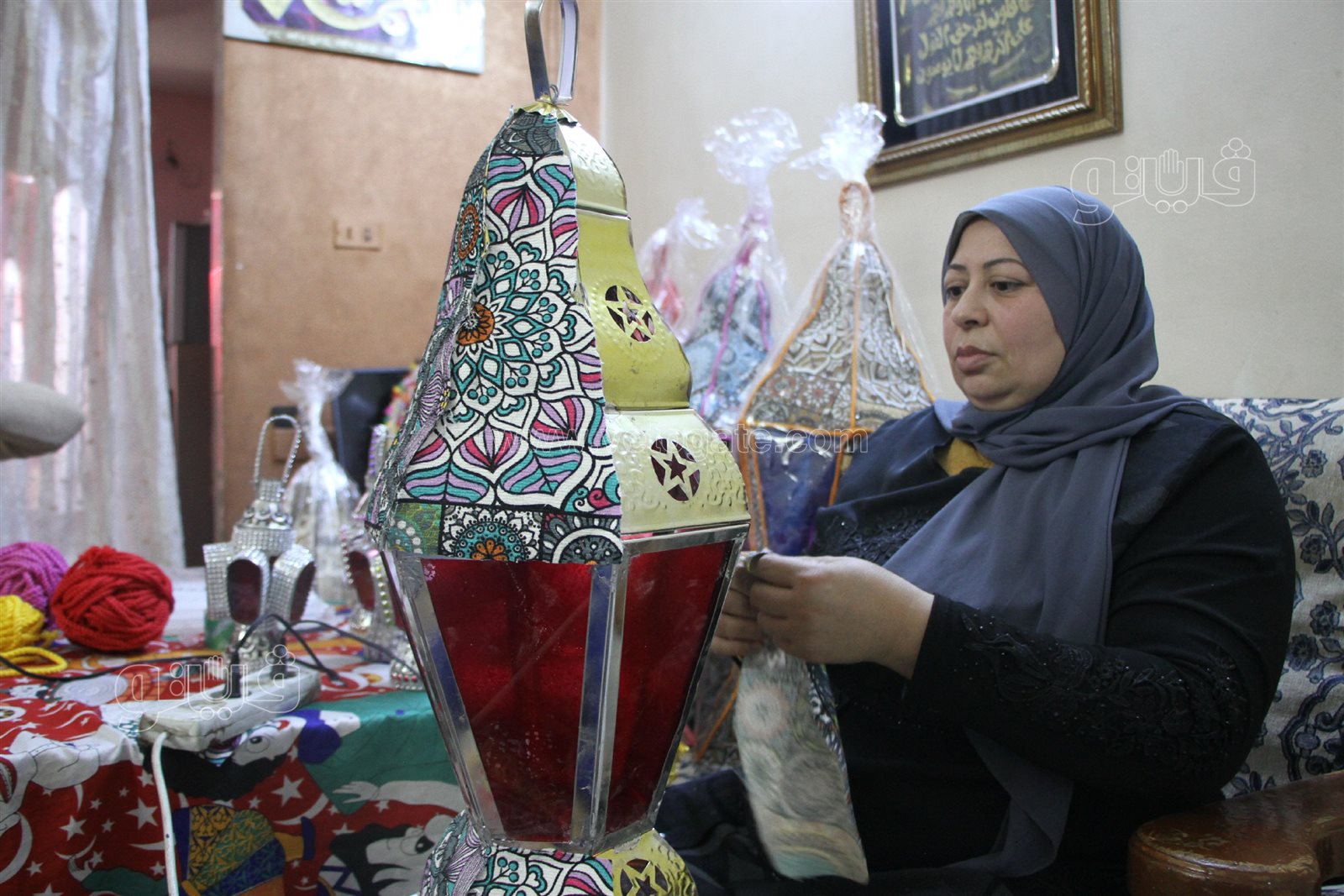 في منزل متواضع بشارع مساكن أحمد ماهر في منطقة باب الخلق في محافظة القاهرة، تجلس العشرينية دنيا في صالة المنزل مع السيدة عبير والدتها، كل واحدة منهما تمسك بفانوس صاج ذهبي اللون وخيط عريض لامع ومسدس الشمع، تلصق دنيا الزينة أو"الستراس" فوق الفانوس بطريقة غاية في الدقة حتى يأخذ شكلا جديدا غير الذي نعتاده في شهر رمضان، "إحنا بقالنا حوالي ٣ سنين شغالين في تزيين الفوانيس الصاج بالستراس والقماش من غير الشغل ده منحسش برمضان".