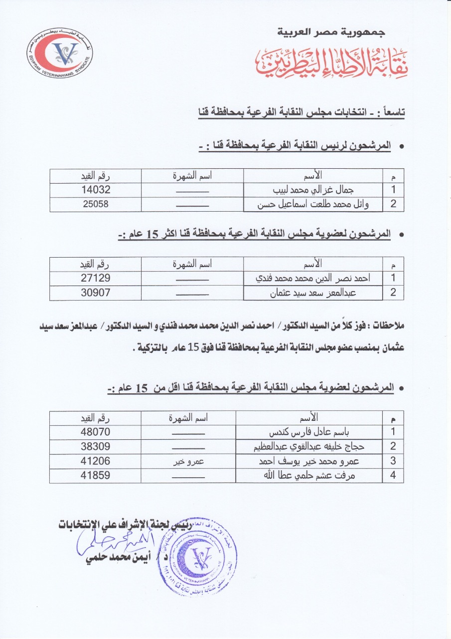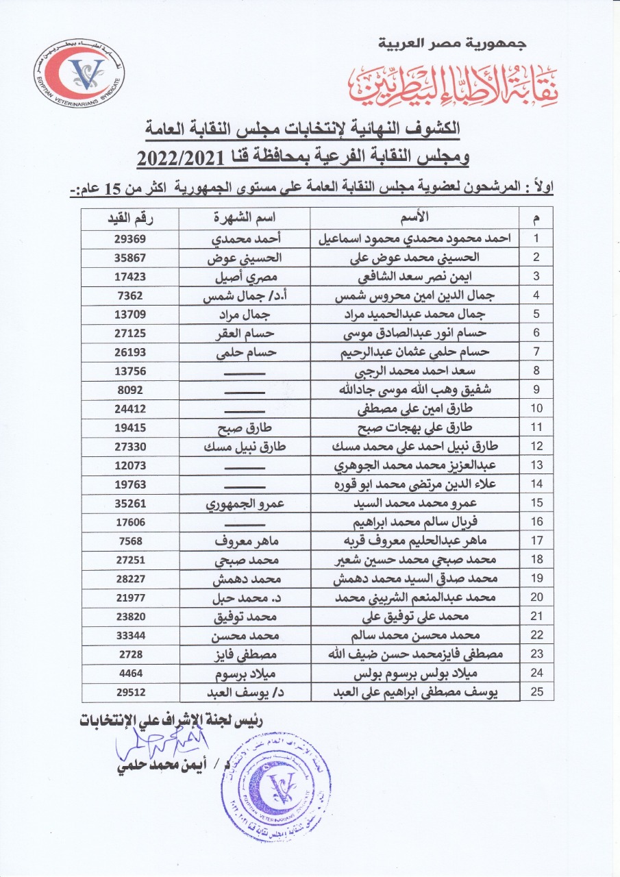 وتنشر «فيتو» كشوف المرشحين في انتخابات التجديد النصفي للنقابة العامة ونقابة قنا الفرعية والمقرر إقامتها يوم 9 مارس المقبل.